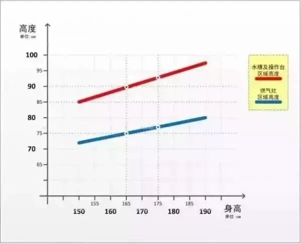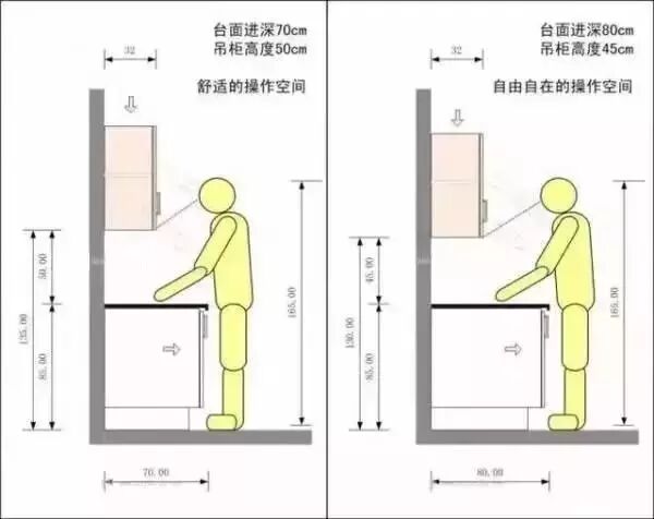 厨房主要讲柜橱台面的高度尺寸配置,因为这个尺寸配置不到位的话,就会像小编开头说的那样“做一顿饭腰酸背痛,比打仗还辛苦”。所以,橱柜的设计一定要根据经常做饭的那个人身高来确定