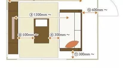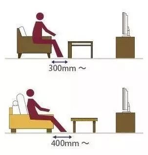 ① 沙发与茶几间的距离:至少需要300mm以上,当然,如果能留出400mm以上就能愉快的放松脚了。