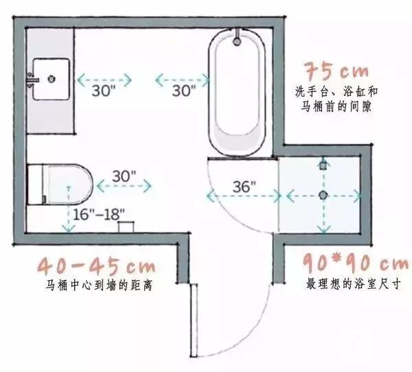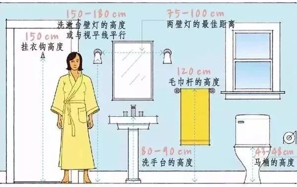 ① 洗漱台、浴缸和马桶前:至少空开300mm;